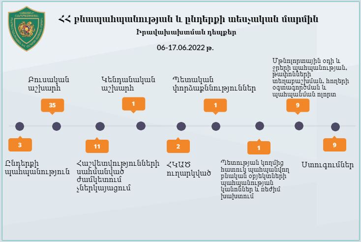 ՀՀ բնապահպանության և ընդերքի տեսչական մարմնի կողմից 2022 թվականի հունիսի 6-ից 17-ն ընկած ժամանակահատվածում կատարված աշխատանքների վերաբերյալ Իրականացված վերահսկողության ընթացքում արձանագրվել է 61 դեպք, որից 37 դեպքով հաշվարկվել է 54.753.190 ՀՀ դրամի չափով շրջակ