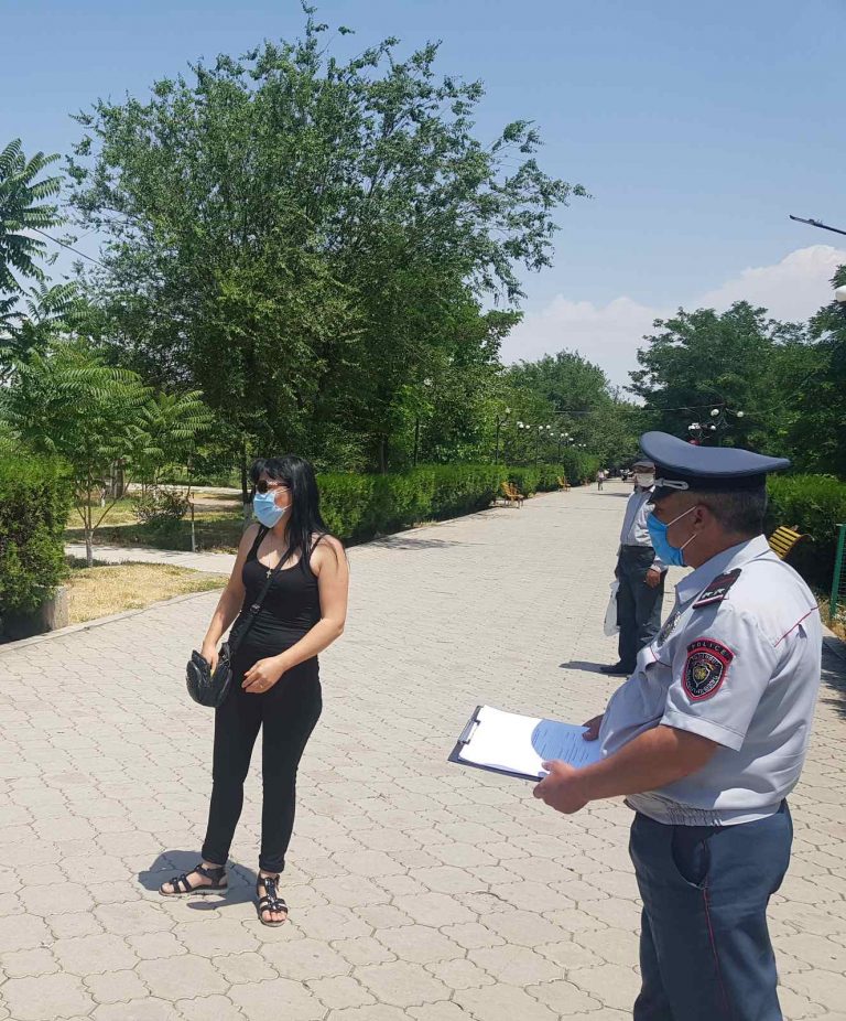 Հունիսի 19-ին Բնապահպանության և ընդերքի տեսչական մարմնի ու ՀՀ ոստիկանության աշխատակիցները համատեղ Արմավիր քաղաքի հանգստի գոտիների բացօթյա տաղավարներում քաղաքացիների շրջանում իրականացրել են բացատրական աշխատանքներ՝ առնվազն 1․5 մ հեռավորություն պահպանելու անհրաժեշտության, դիմակները պատշաճ կրելու կանոնների, մարդկային կուտակումներից խուսափելու վերաբերյալ։