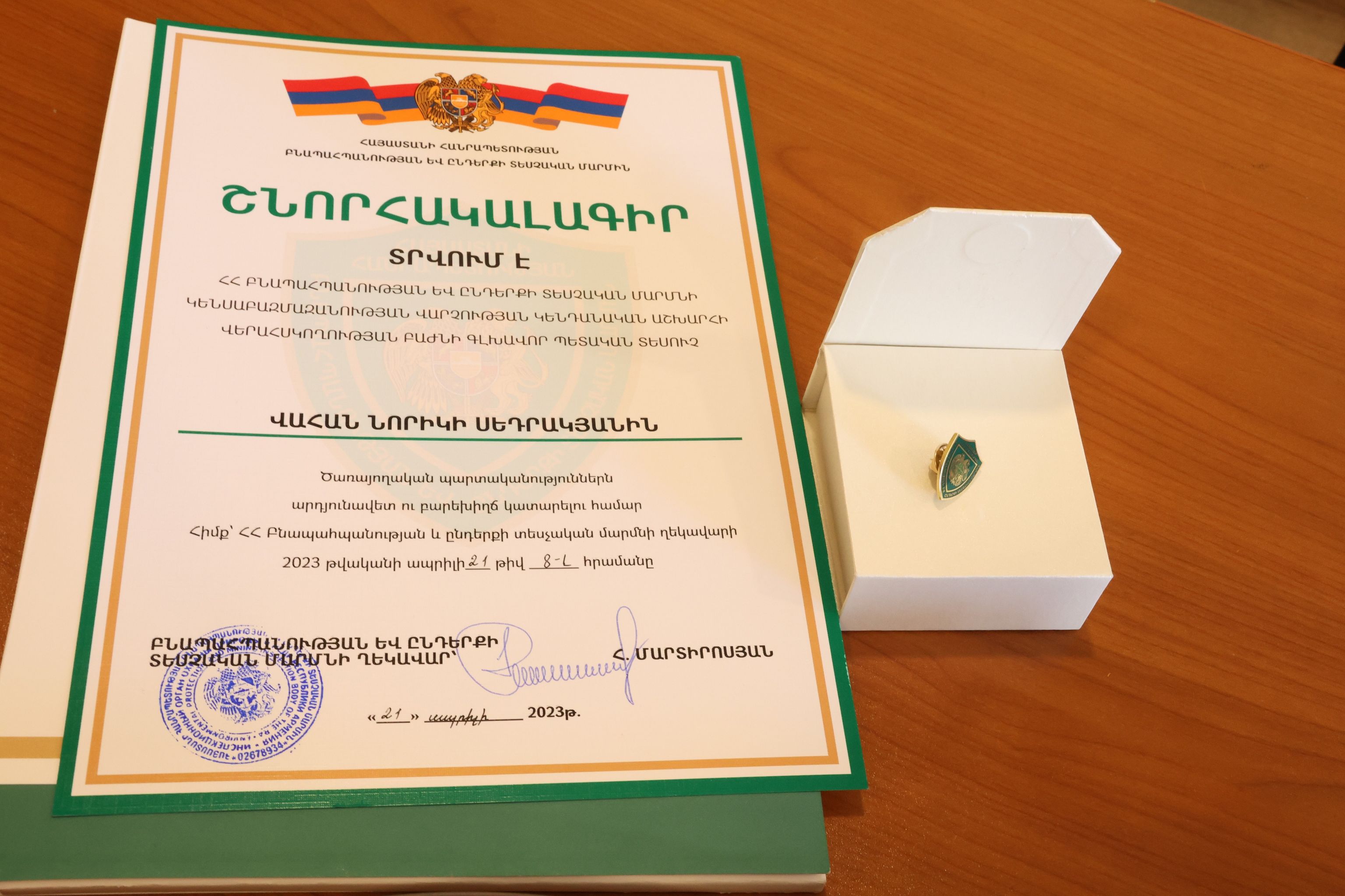 ՀՀ բնապահպանության և ընդերքի տեսչական մարմնի ղեկավար Հովհաննես Մարտիրոսյանը Կենսաբազմազանության վերահսկողության վարչության կենդանական աշխարհի վերահսկողության բաժնի գլխավոր պետական տեսուչ Վահան Նորիկի Սեդրակյանին կենսաթոշակի անցնելու, Ռիսկի գնահատման և վերլուծությունների վարչության ռիսկի վերլուծությունների բաժնի պետ Ռոզա Հակոբի Սեխլեյանին աշխատանքն ավարտելու կապակցությամբ, ծառայողական պարտականություններն արդյունավետ ու բարեխիղճ կատարելու համար պարգևատրել է շնորհակալագրով և տարբերանշանով: