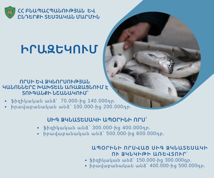 - իրավաբանական անձի նկատմամբ' 500.000-ից մինչև 600.000 ՀՀ դրամի չափով՝ խախտողի անձնական սեփականություն հանդիսացող որսագործիքների, ձկնորսական ցանցերի, ինչպես նաև հիշյալ խախտումները կատարելու գործիք համարվող մյուս առարկաների, ապօրինի որսված կամ ապօրինի արդյունահանված սիգի կամ սիգի ձկնկիթի բռնագրավմամբ: