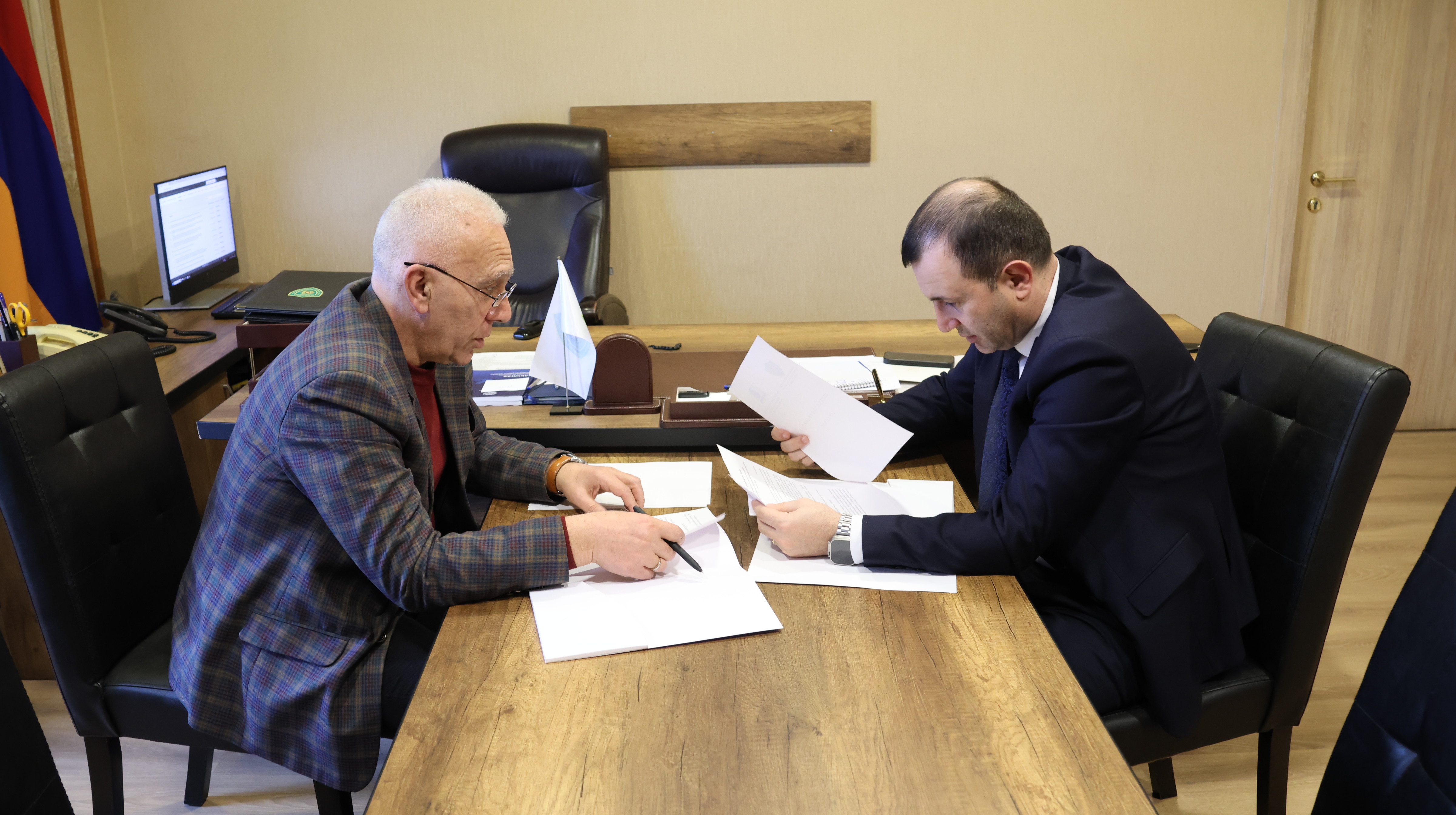 The Head of the Environmental Protection and Mining Inspection Body, Hovhannes Martirosyan, and Armen Babayan, Director of the Institute of Water Problems and Hydro-Engineering named after I.V. Yeghiazarov, have signed a memorandum of cooperation aimed at developing scientific, expert, and research capacities in the field of environmental protection and subsoil use.