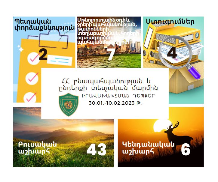 ՀՀ բնապահպանության և ընդերքի տեսչական մարմնի կողմից 2023 թվականի հունվարի 30-ից փետրվարի 10-ն ընկած ժամանակահատվածում կատարված աշխատանքների վերաբերյալ Իրականացված վերահսկողության ընթացքում արձանագրվել է 58 դեպք, որից 37 դեպքով հաշվարկվել է 9.186.040 Հ
