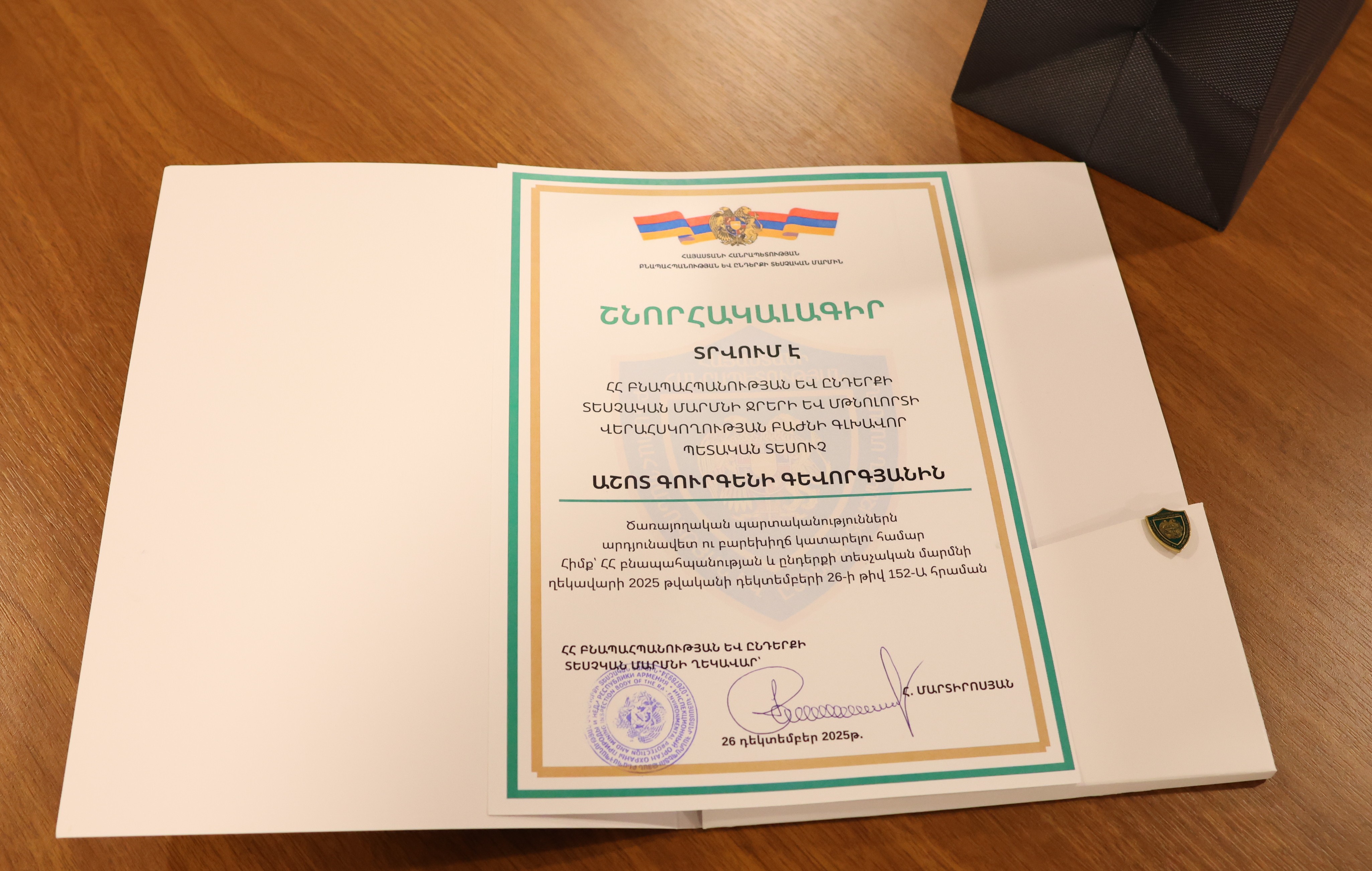 Բնապահպանության և ընդերքի տեսչական մարմնի ջրերի և մթնոլորտի վերահսկողության բաժնի գլխավոր պետական տեսուչ Աշոտ Գուրգենի Գևորգյանը կենսաթոշակի անցնելու կապակցությամբ, ծառայողական պարտականություններն արդյունավետ ու բարեխիղճ կատարելու համար պարգևատրվել է շնորհակալագրով և հուշանվերով։
