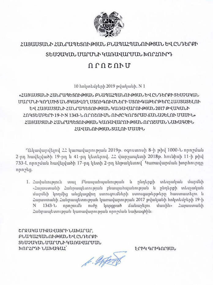 Բնապահպանության և ընդերքի տեսչական մարմնի կառավարման խորհուրդը որոշել է հավանություն տալ «Հայաստանի Հանրապետության բնապահպանության և ընդերքի տեսչական մարմնի կողմից անցկացվող ստուգումների ստուգաթերթերը հաստատելու և Հայաստանի Հանրապետության կառավարության 2017 թվականի հոկտեմբերի 19-ի N 1343-Ն որոշումն ուժը կորցրած ճանաչելու մասին» Հայաստանի Հանրապետության կառավարության որոշման նախագծին։